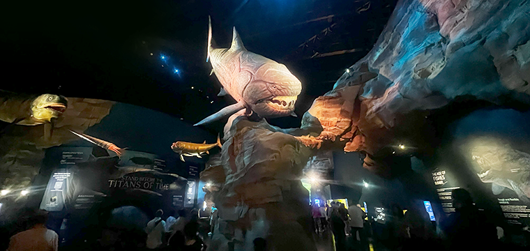 Across the expansive hall, prehistoric giants appear to swim through the air. Each replica is paired with the interactive Fossil Quest, where visitors can uncover and explore these ancient creatures in 3D, bringing them vividly to life.
