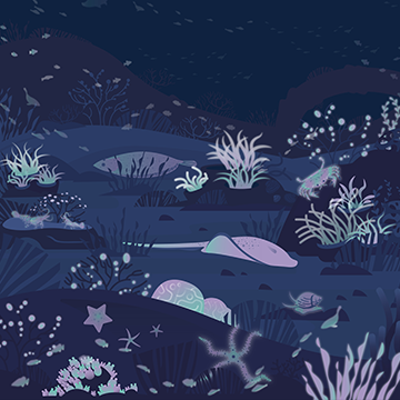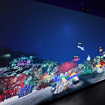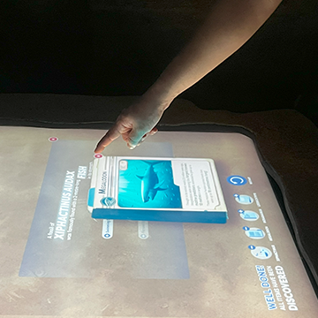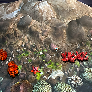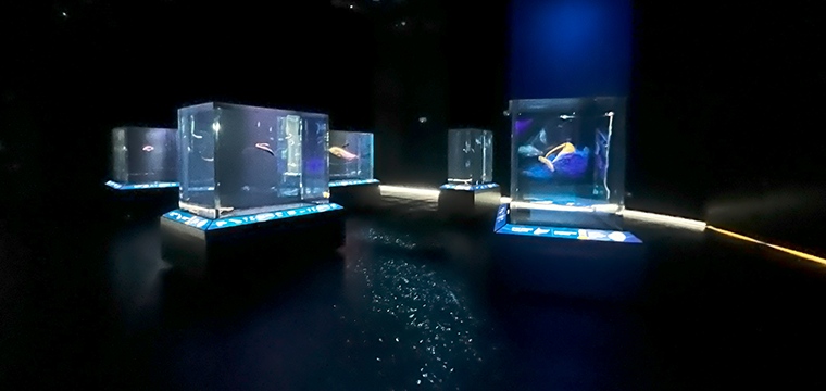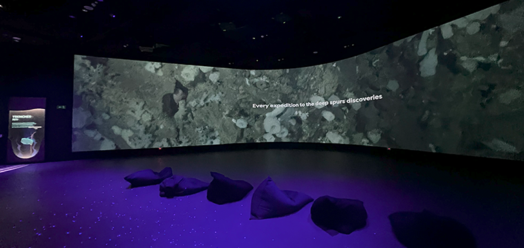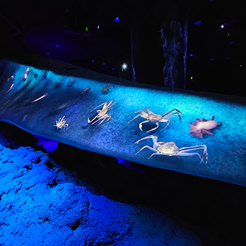 Sunlight diminishes as visitors descend deeper into the ocean. Projection-mapped wall graphics show the unique ecology of the ocean floor, also called the Benthos.