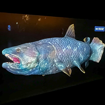 As they turn the corner, they are met by the gaping jaw of an animatronic Dunkleosteus.