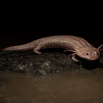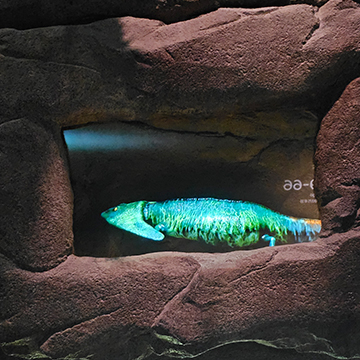 In Emergence onto Land, visitors follow this journey, encountering amphibians and catching glimpses of prehistoric species hidden within the wall caves.