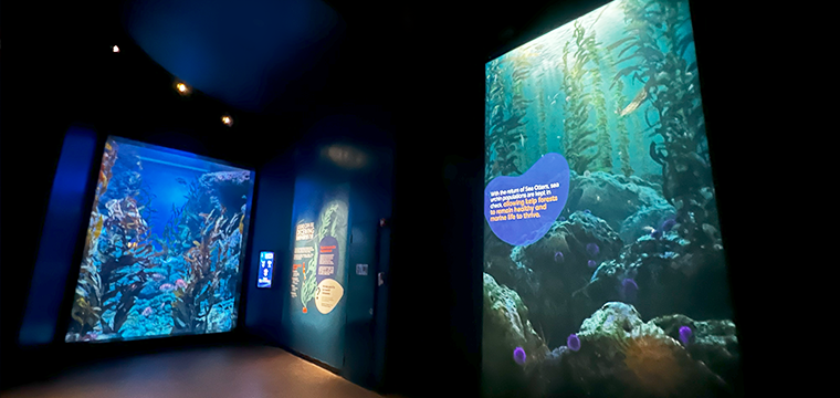 The Coral Garden showcases vibrant shallow-water ecosystems and the fragile balance humans have disrupted. This fragility continues in the Kelp Forest, where the loss of sea otters caused the kelp ecosystem to collapse, threatening countless marine species.