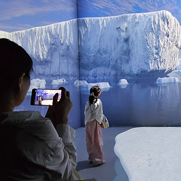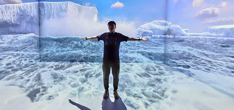 An immersive anamorphic projection captures the dramatic moment an iceberg crashes into the sea, sending a massive wave surging towards the audience.